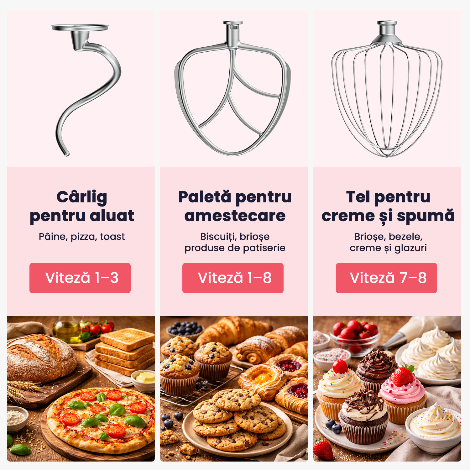 Mixer cu bol de 7L din inox, STARCREST SKM-2070BK, 2.1 kg aluat, putere 2000W, 3 accesorii din inox, 8 viteze + Turbo, Negru