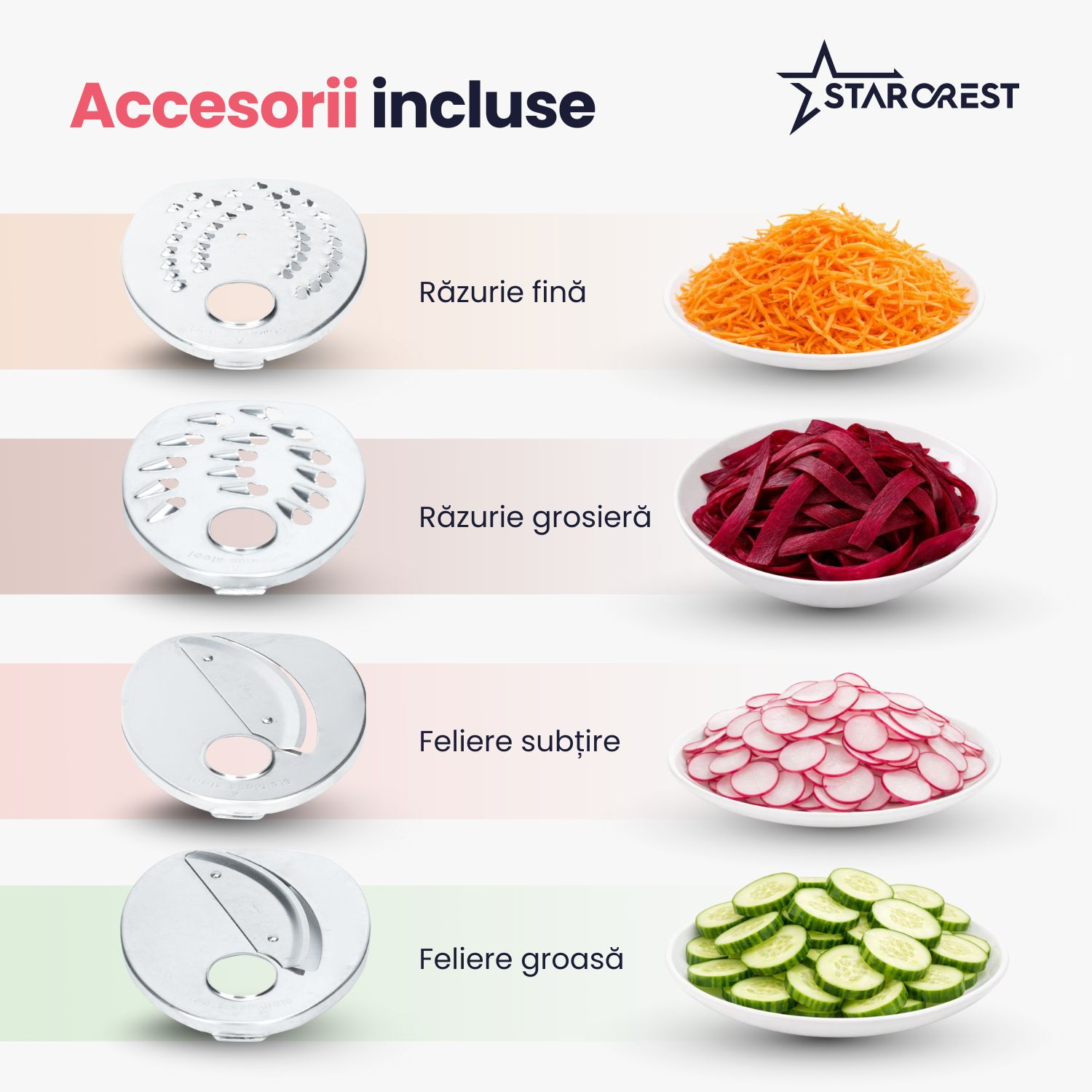 Răzătoarea electrică STARCREST este echipată cu 7 discuri din inox, care îți oferă multiple opțiuni de tăiere: