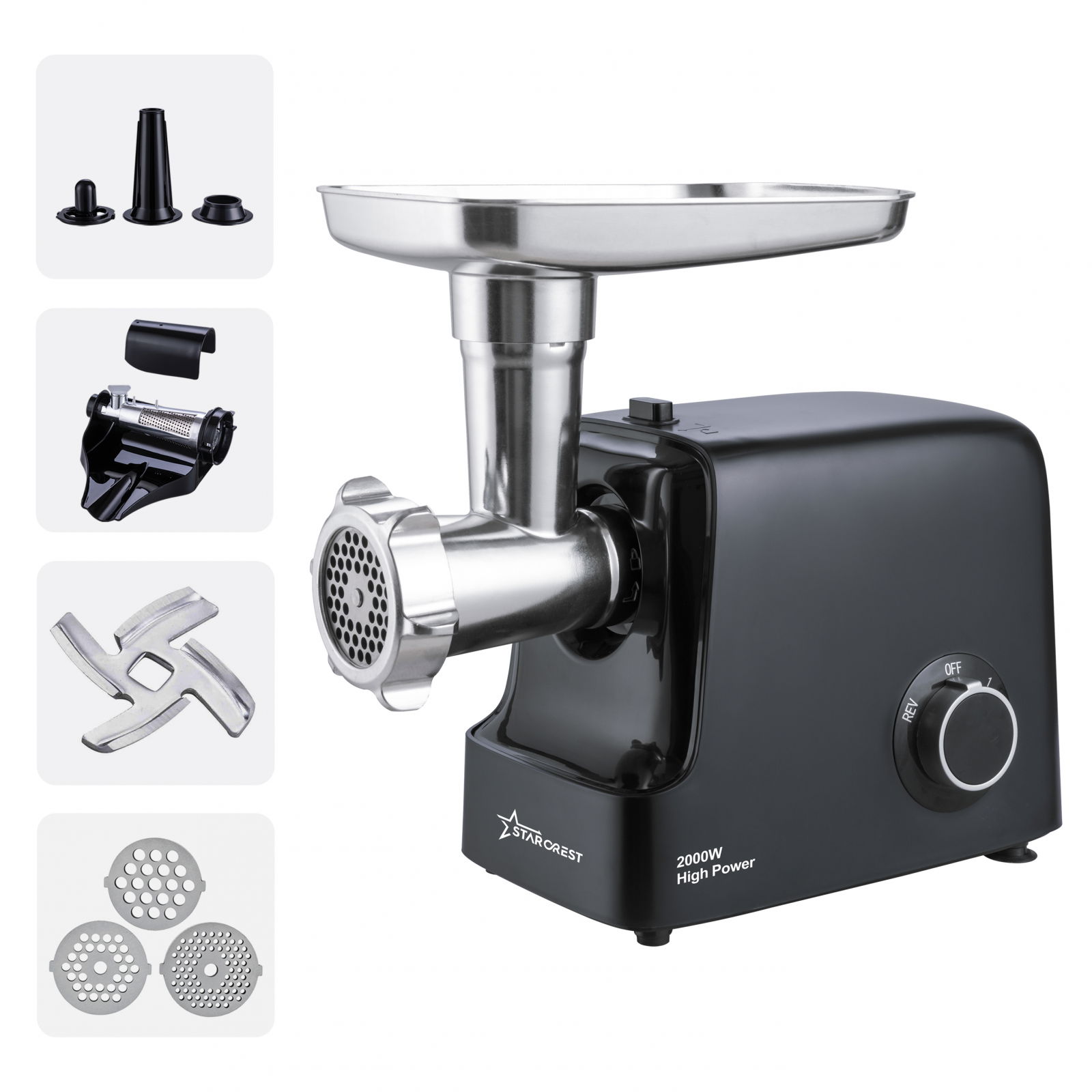 STARCREST RESIGILAT - Masina de tocat STARCREST SMG-2000BK, 2000 W, Accesoriu rosii si carnati, 3 site de taiere, Cutit inox, Negru