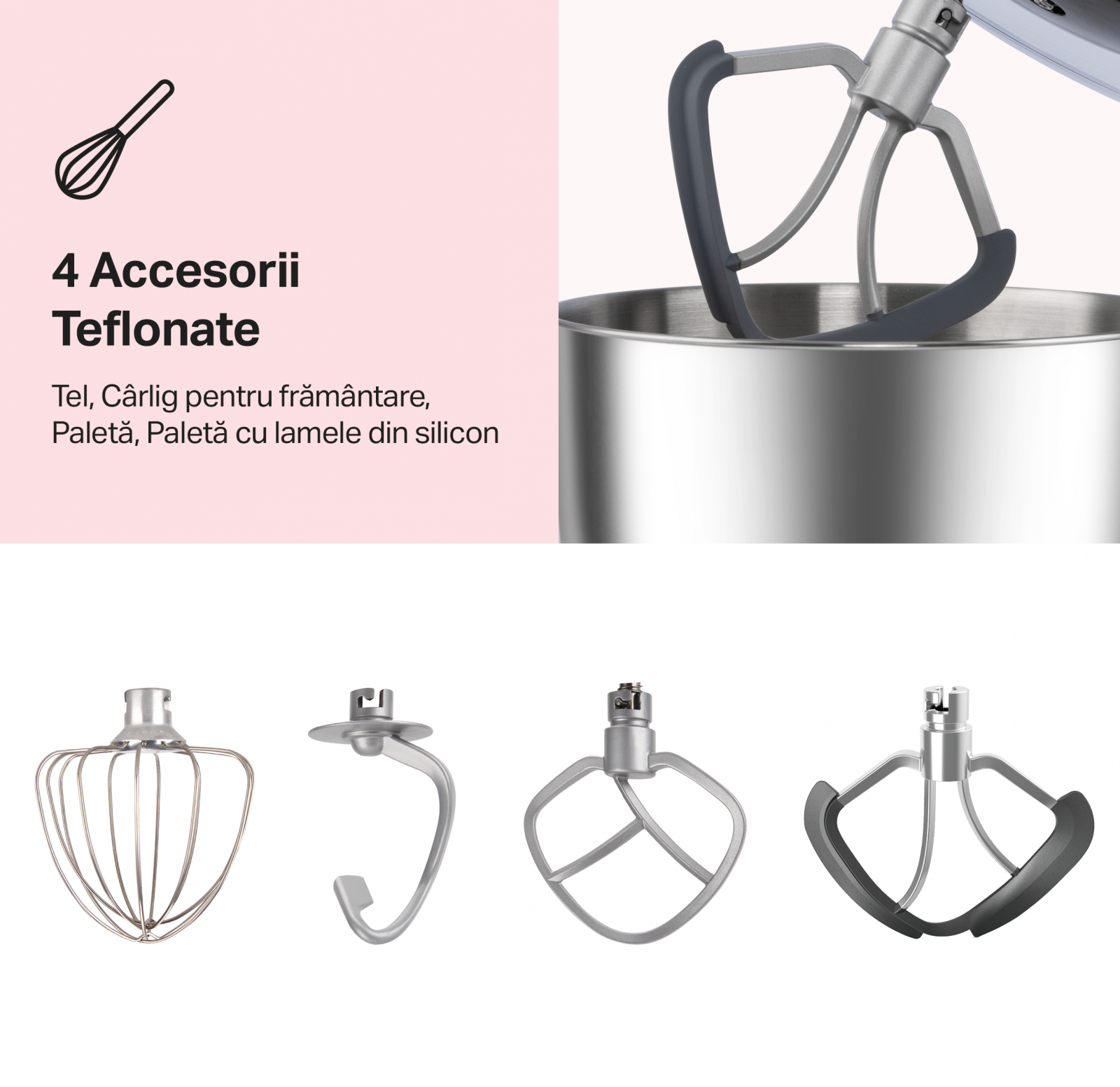 Accesorii incluse: tel din inox, cârlig pentru frământare, paletă pentru amestecat, paletă